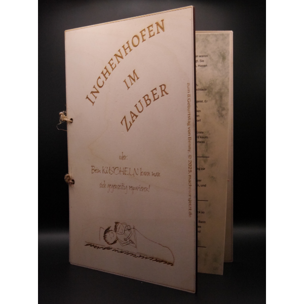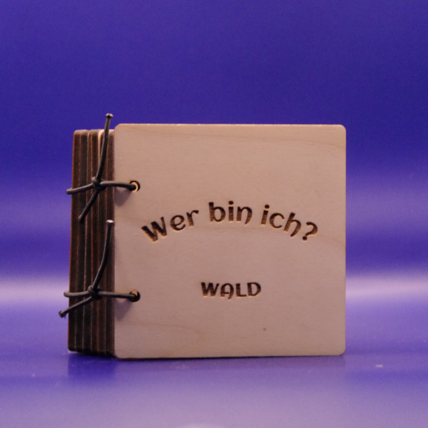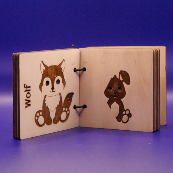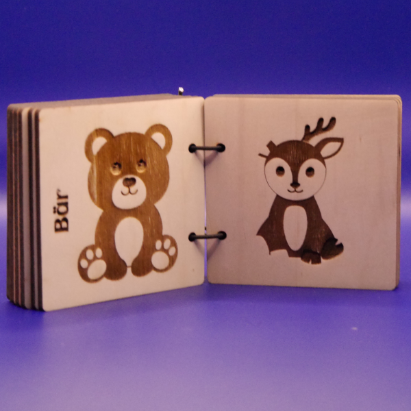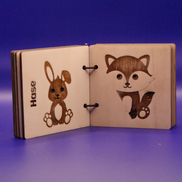 Taktile Holzbilderbücher aus lasergeschnittenem Birkenholz mit niedlichen Tierseiten wie Hase und Wolf – robust, nachhaltig und interaktiv.