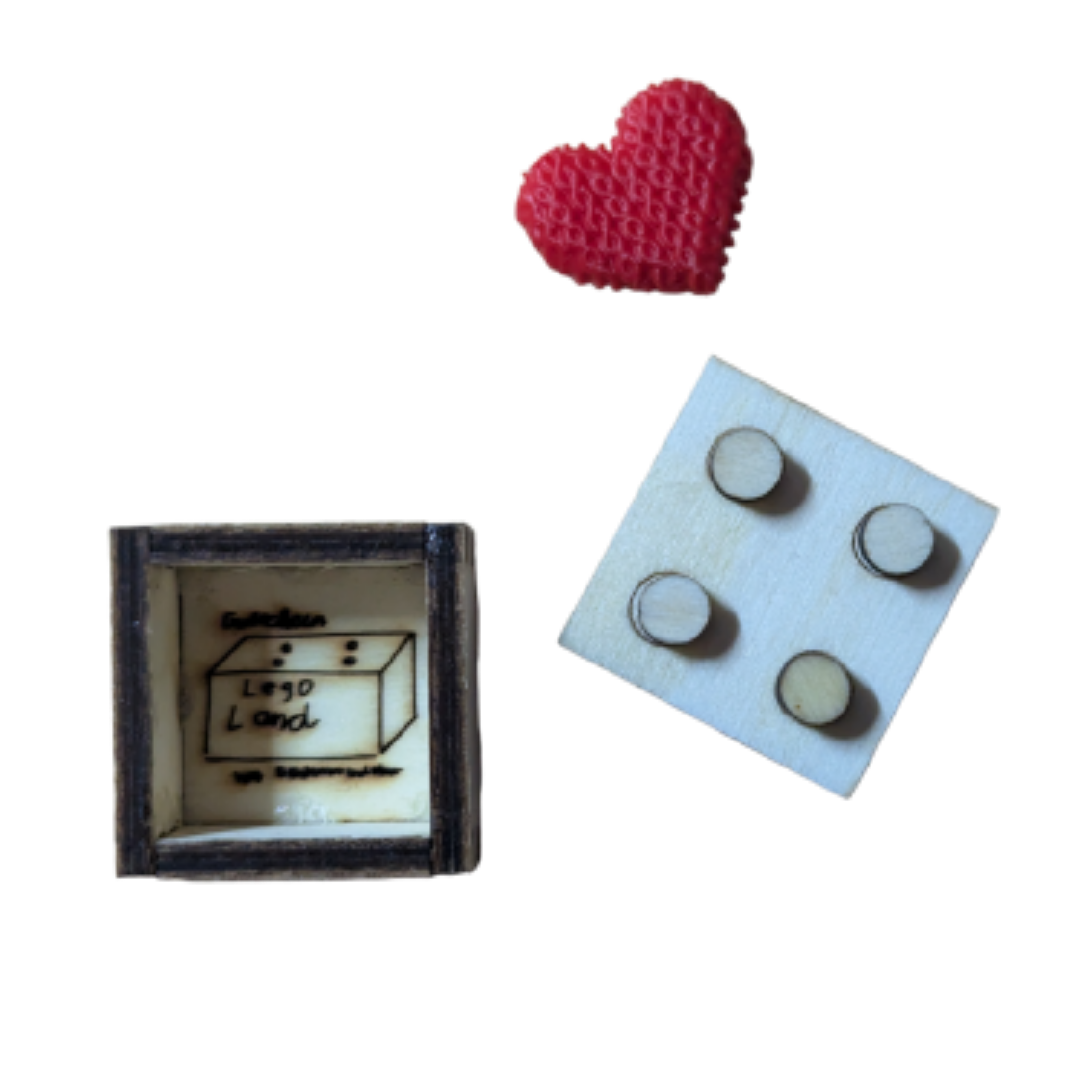 Kreative Gutscheinbox aus Holz im Klemmbaustein-Design, personalisiert durch echte Kinder-Handschrift per Lasergravur und verziert mit 3D-gedrucktem Herz – ein originelles, persönliches Geschenk für jeden Anlass.