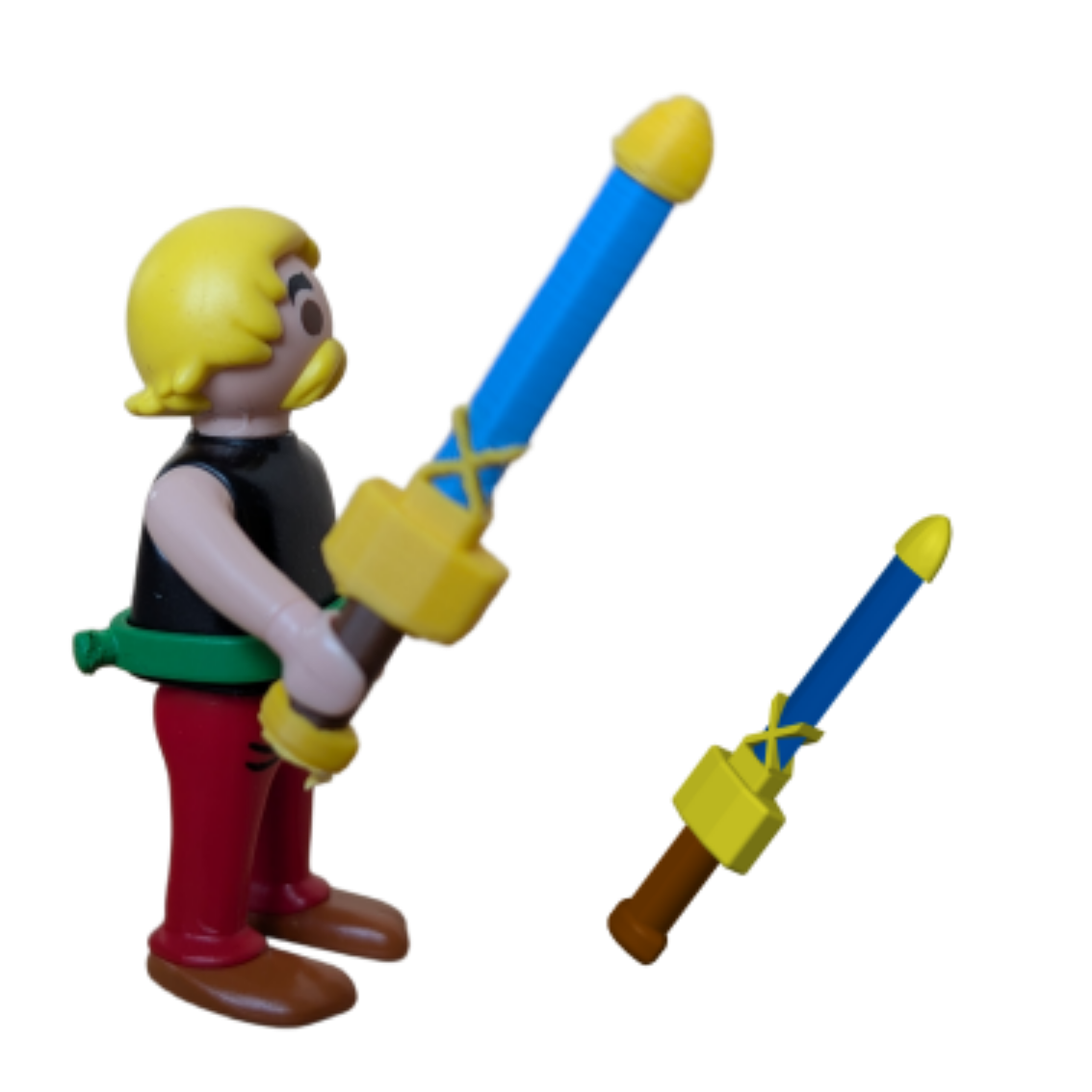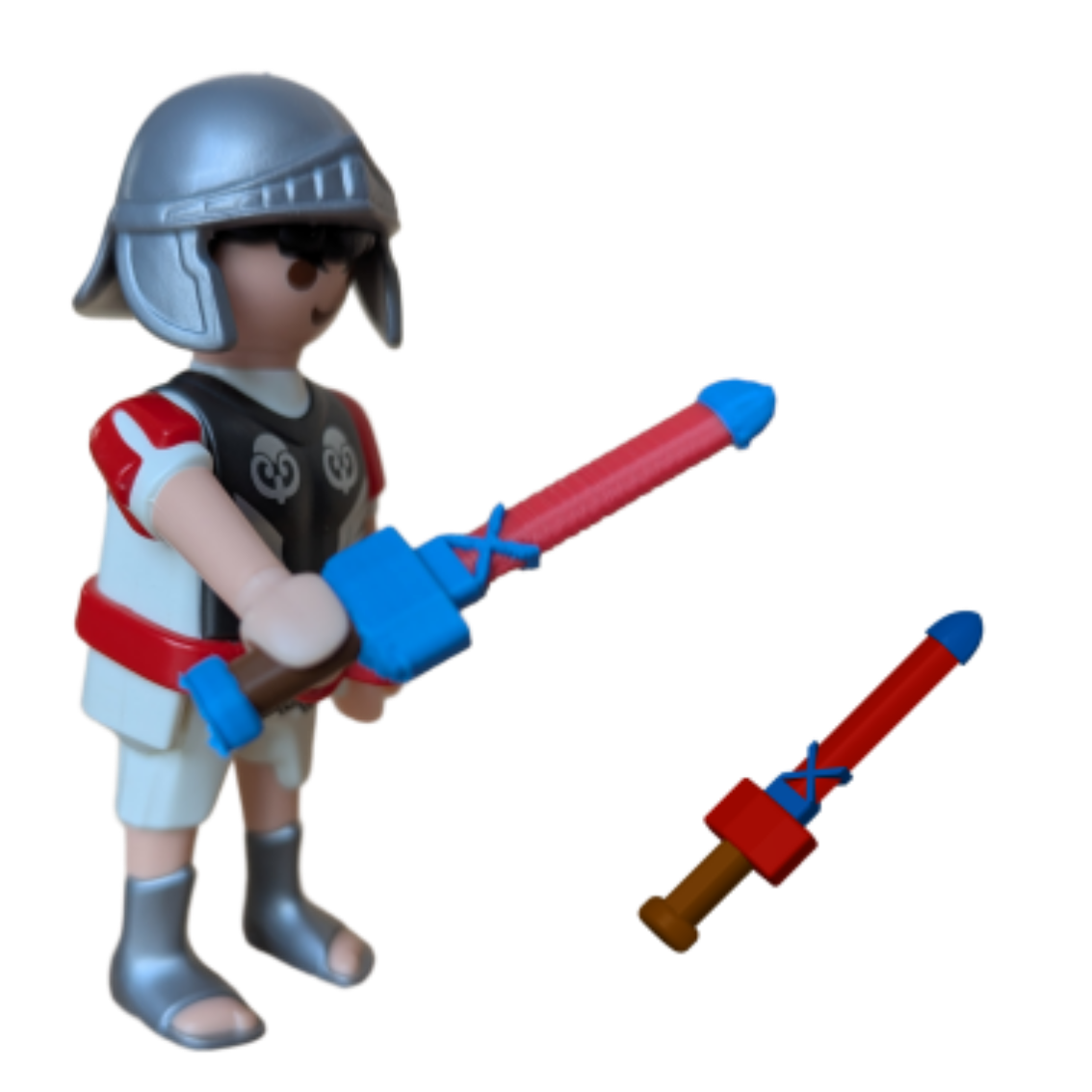 Fantasievolles Schwert als Zubehör für Spielfiguren, im 3D-Druckverfahren gefertigt und speziell für kreatives Rollenspiel oder eigene Figuren-Abenteuer entwickelt.
