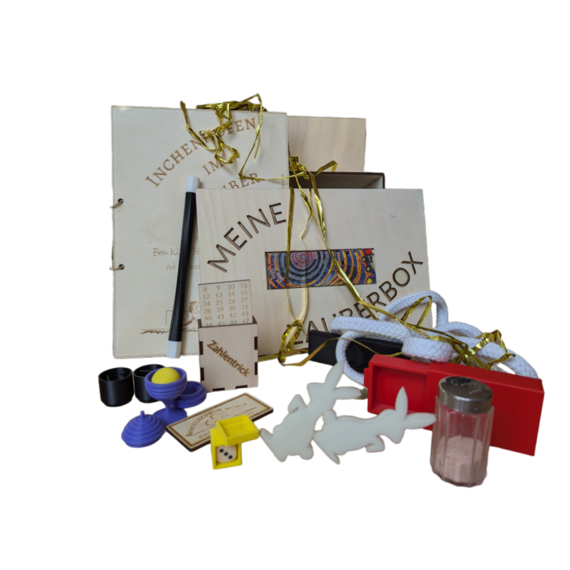Zauberbox-Set für Kindergeburtstage: Gravierte Holzkiste mit Zaubertricks aus Laserschnitt, 3D-Druck und klassischen Requisiten. Kreativ-Idee für Magiefans – als Geschenk und Andenken nach der Zauber-Schnitzeljagd.